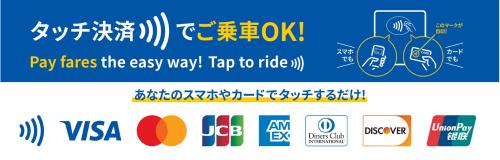 乗降時、専用端末にタッチ決済対応マークのあるカード(クレジット・デビット・プリペイド)またスマートフォン等をタッチするだけで、サインも暗証番号の入力も不要で、スピーディーかつ安心・安全にお支払いが完了します。