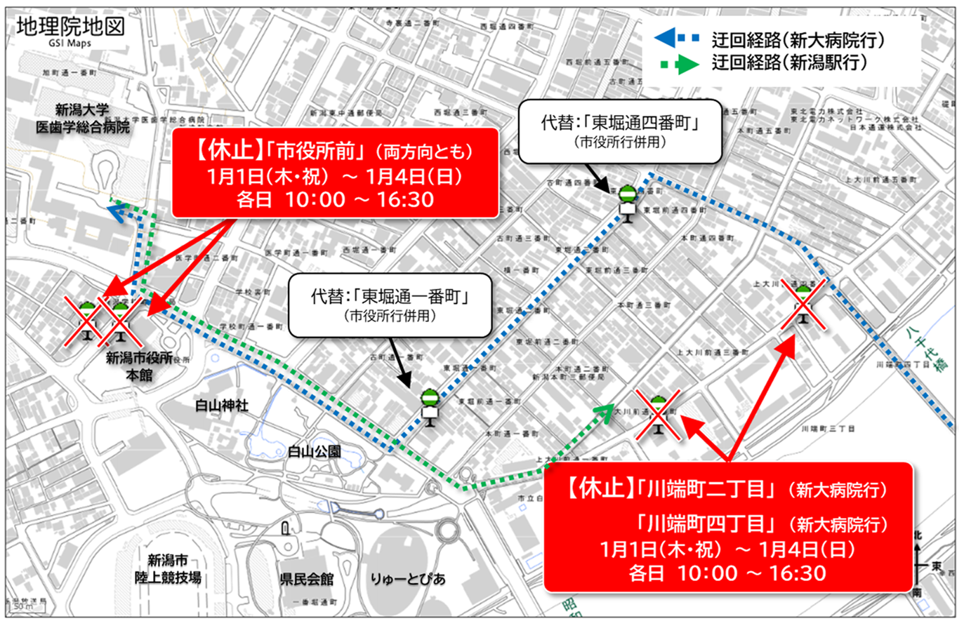 | 代替停留所 | 東堀通一番町(市役所前行) 詳しくは、新潟市ホームページをご覧ください。 |