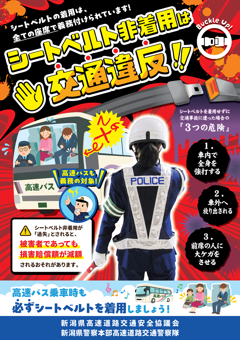 【高速バス】シートベルト着用は全ての座席で義務です(新潟県高速道路交通安全協議会・新潟県警察)