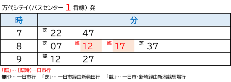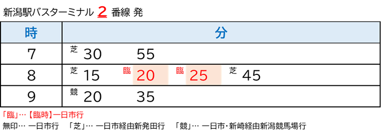 | 運行区間 | 万代シテイ(バスセンター①番線) ~ 新潟駅(②番線) ~ 県立大学前 ~ 一日市 |