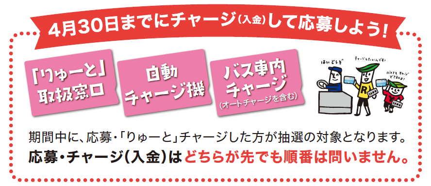 | ■応募は、Web・ハガキいずれかの方法でお一人様1回までとさせていただきます。 ■応募いただく際の通信料・ハガキ・切手等代金はお客様負担となります。 ■必要事項の入力・記入漏れがある場合、応募は無効となります。 ■応募いただいたお客様情報は、今回の「りゅーと」チャージプレゼント企画以外に使用いたしません。 ■Webまたはハガキ以外でのご応募は受け付けておりません。 ■応募結果や当選確認等、抽選に関するお問い合わせには一切お答えできません。 ■抽選の結果は、当選ハガキの発送をもって代えさせていただきます。 ■以下に該当する場合、当選無効となります。あらかじめご了承ください。