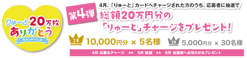■「りゅーと」カードは、20,000円までチャージ(入金)できるカードです。上限を超えるチャージ(入金)はできません。当選された方は、プレゼント受け取り時のカード残額にご注意ください。